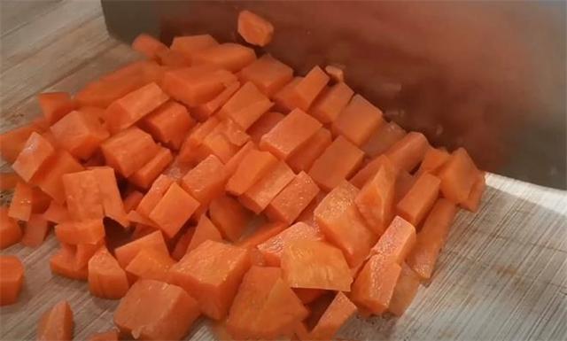 1.準備一根胡蘿卜去皮,先切片,再切成條,最后切成小丁。