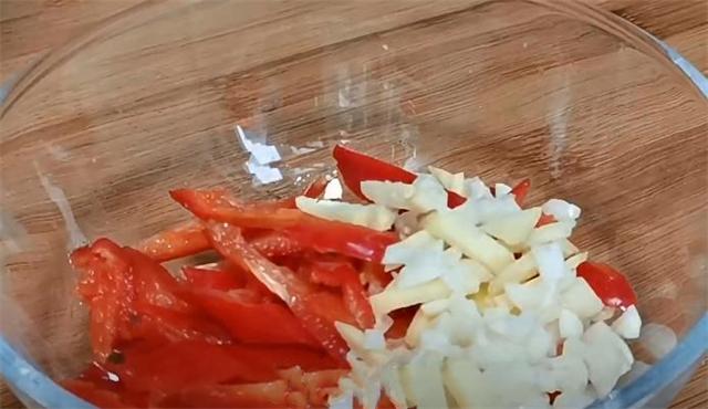 2.準備一根紅椒切開,然后將它切成絲,切好放入碗中備用,準備一塊生姜切成絲,可以去除空心菜的青澀味,準備三瓣大蒜切成蒜末,放入碗中備用。