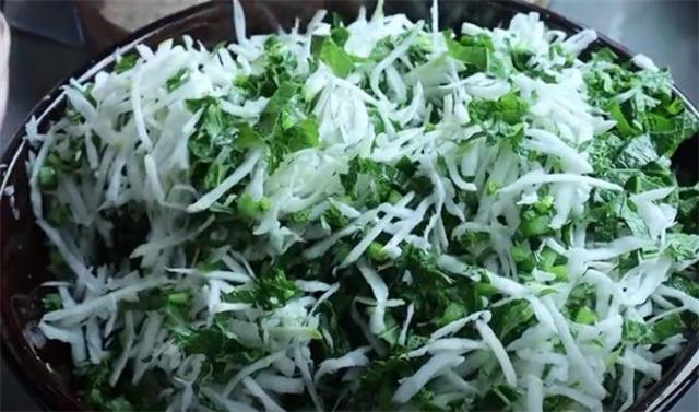 4.芥菜疙瘩全部擦絲后,再把芥菜葉子全部切成小段,芥菜葉子全部切好后,和擦好的芥菜絲均勻地拌在一起。