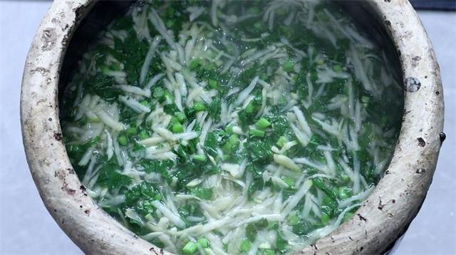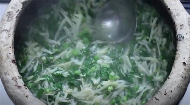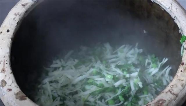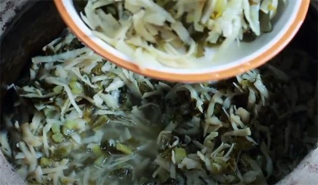 11.今天是第二天,把昨天剩的芥菜,繼續倒入開水鍋里焯燙10秒鐘,燙好的芥菜繼續倒入這個甕里面,然后倒入提前熱好的面湯進去,現在基本上家家都有暖氣了,可以放在暖氣旁邊發酵,如果家里溫度過低,可以每天把甕里的面湯倒出來,在鍋里面加熱一下,加熱后重新倒入甕里面發酵,重復2-3次,一周后就可以吃到酸菜了。