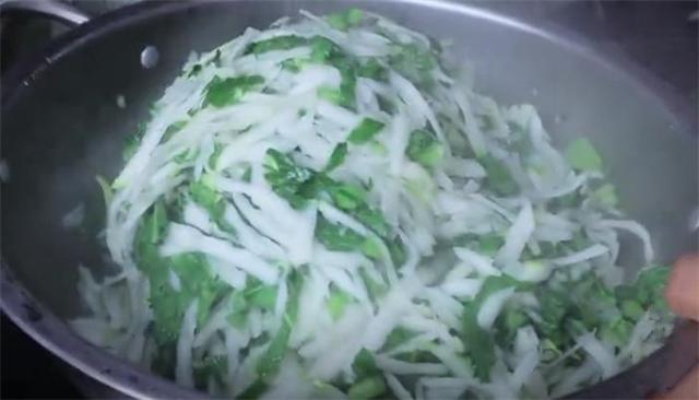 7.重新燒一大鍋水,把拌勻的芥菜絲和葉子放入開水鍋里燙一下,燙大約10秒鐘就可以,然后用大漏勺把芥菜撈入盆里。