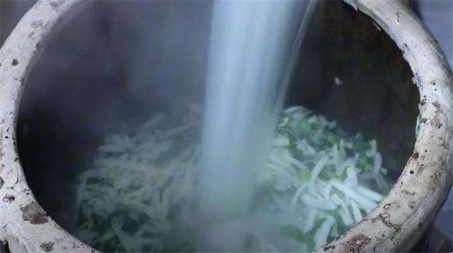 9.然后直接把面湯倒進甕里面去,我們這里腌酸菜,全程都不需要加鹽,主要是靠這個面湯通過溫度來讓它自然發酵變酸。