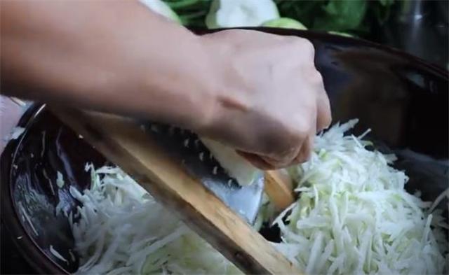 3.芥菜全部處理好后,然后用擦子把芥菜疙瘩全部擦成絲,我們這邊腌酸菜用的是這種扁圓口的擦子,擦絲的時候,一定要小心,不要把手擦傷了。