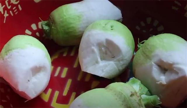 2.芥菜疙瘩表面有很多坑坑洼洼的地方和泥土,然后用刷子將這些芥菜疙瘩全部仔仔細細的刷洗干凈,再把這些芥菜葉子也清洗干凈,這些芥菜疙瘩表面還有些坑坑洼洼的地方不太好清洗,直接用刀把上面不好清洗的地方削干凈。