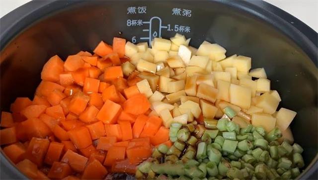 6.大米現在已經泡得差不多了,把它清洗一下,洗兩遍就可以了,洗好倒進電飯鍋里面,然后把切好的胡蘿卜,土豆和豆角加進來,把表面鋪平整,再把調好的料汁慢慢倒進去,加入一勺香油,再加入適量清水,水位剛好沒過菜就可以了,蓋上蓋子按下煮飯鍵。