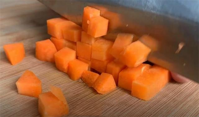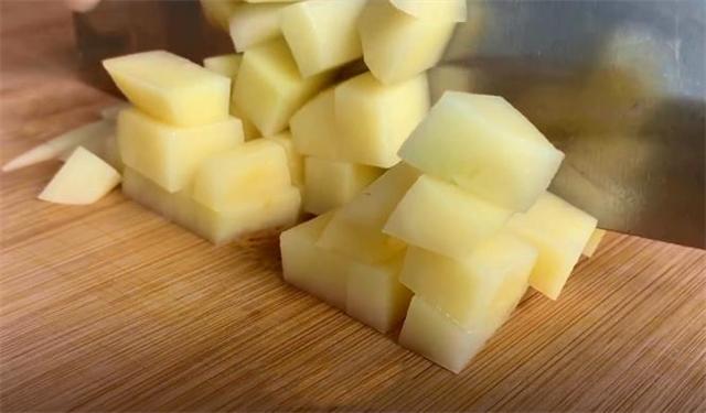 4.準備兩個去皮小土豆,切成土豆丁放碗里備用。