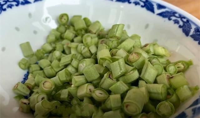 2.趁這個時間我們來準備點配菜,準備一小把豆角洗凈,將它切成小丁,放碗里備用。