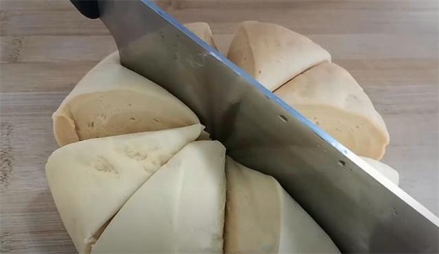 2.醒好后再把面團揉5分鐘,還是反復搓著揉,揉好后用刀把面團平均分成八份。