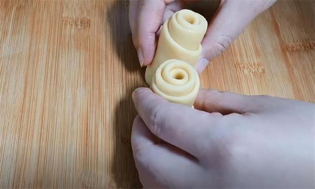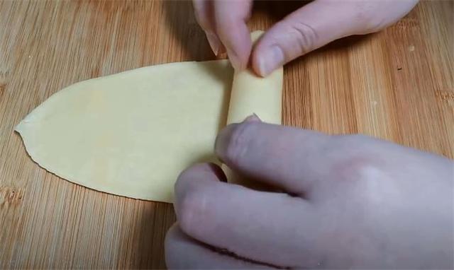 3.案板上倒點油,取出一個面劑子,手指往里揉,揉好后按扁,用搟面杖搟成牛舌狀,從一頭卷起來。