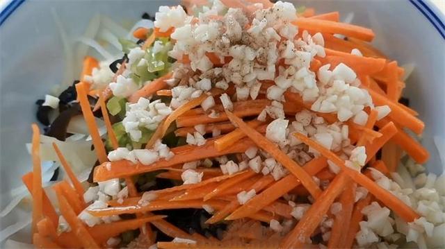 7.將焯好水的土豆絲放進(jìn)大碗里,再放入木耳,胡蘿卜絲和青椒絲,最后倒入蒜末,撒上一點(diǎn)花椒粉,鍋中燒點(diǎn)熱油,油熱澆在胡蘿卜絲上面。