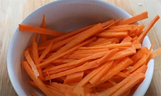 2.準(zhǔn)備半根胡蘿卜,切片再切絲,切好放入碗中,準(zhǔn)備一個(gè)青椒去籽,切好放入碗中備用。