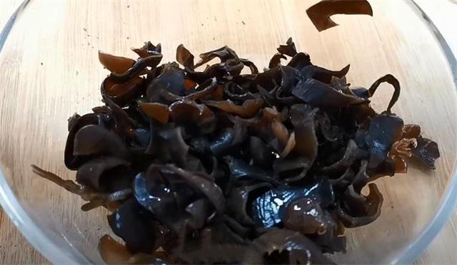 4.這個(gè)木耳是我提前泡發(fā)好的,用剪刀剪去根部,把它切碎,切好放入碗中。