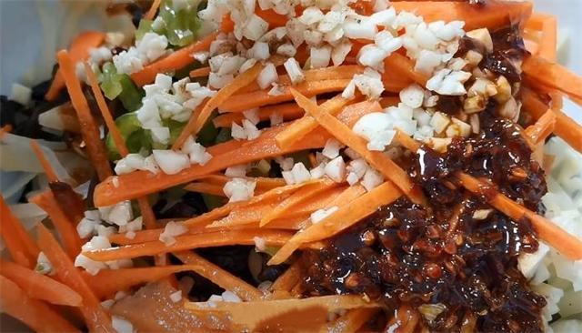 9.然后把料汁澆在土豆胡蘿卜絲上面,用筷子攪拌均勻。
