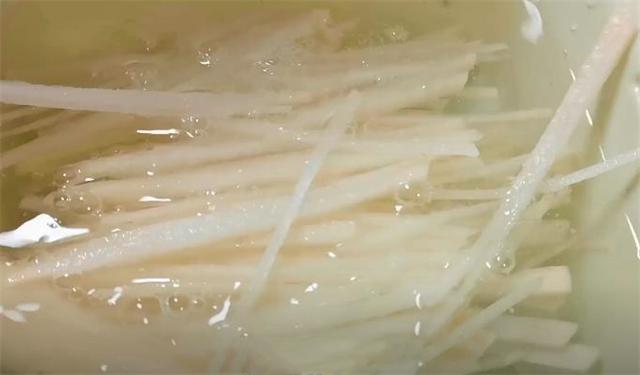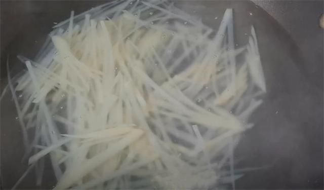 5.鍋中燒開水,把土豆絲倒進(jìn)去,焯水兩分鐘后撈出。