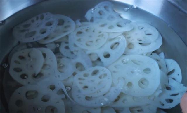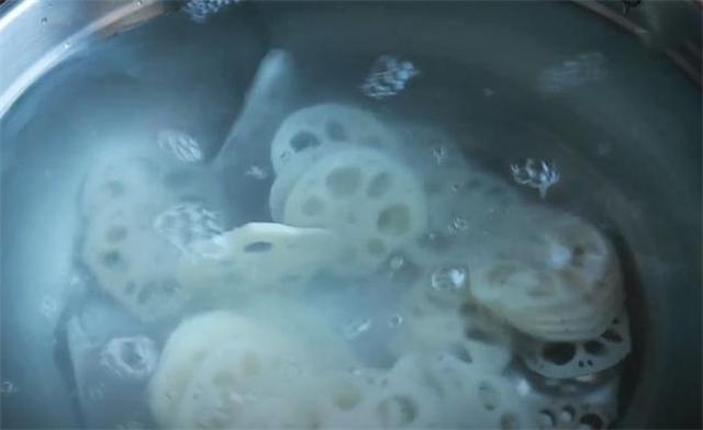 3.鍋里水燒開后,再往鍋里加點(diǎn)醋進(jìn)去,然后把蓮藕放進(jìn)開水鍋里焯水,蓮藕燙15秒左右就可以,再控水撈出來過下涼水,這樣蓮藕的口感才會(huì)更加的清脆爽口。