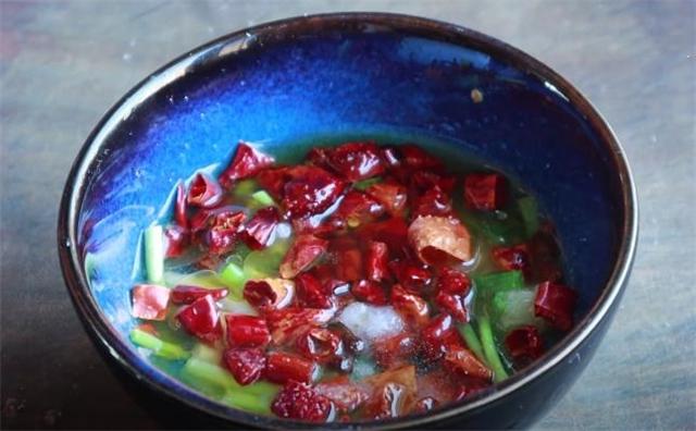 4.接下來準(zhǔn)備一小塊削皮的生姜,全部切碎成生姜末,切好的生姜末裝入碗里面,準(zhǔn)備一小把洗干凈的小蔥,切成稍微長(zhǎng)一些的段,切好的小蔥也裝入碗里面,碗里再加入一把干辣椒段,然后潑入少量熱好的花椒油進(jìn)去,加入一小勺的鹽,再加入一勺白糖,然后再加入稍微多一點(diǎn)的米醋進(jìn)去,再滴入幾滴香油,用筷子攪拌均勻,咱們這個(gè)料汁就調(diào)好了。