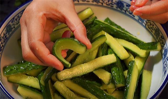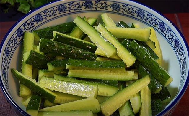 1.黃瓜洗凈切去頭尾,再用刀切成小段,然后再把小段一分為六份,切成小細長條,切好以后裝入盆中,往里面撒上一點食鹽,用手抓勻后放旁邊腌制兩個小時,把黃瓜里面的水分腌出來。