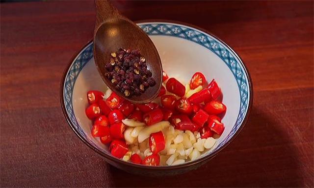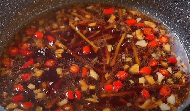 3.起鍋燒油,下入姜、蒜、小米辣和花椒炒香,炒香之后加入半碗清水,再加入適量的生抽和陳醋,再加入少許老抽,加適量的食鹽和白糖攪拌均勻,大火煮開之后再煮兩分鐘,關火放涼。