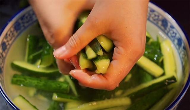 5.黃瓜已經腌出了很多的水分,把腌出的水分倒入到碗中,再往黃瓜里面倒入清水,把黃瓜上面的鹽分洗掉,再把黃瓜中的水分盡量用手擠出來,這一步的目的,是為了能夠擠干凈黃瓜中的水分,讓黃瓜更容易吸收料汁入味,吃起來口感會更脆。