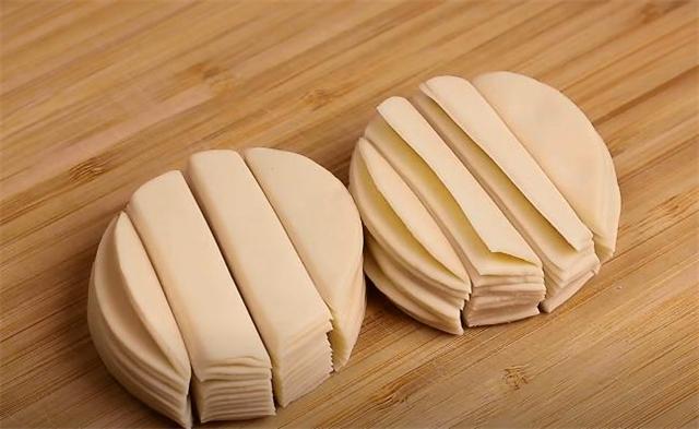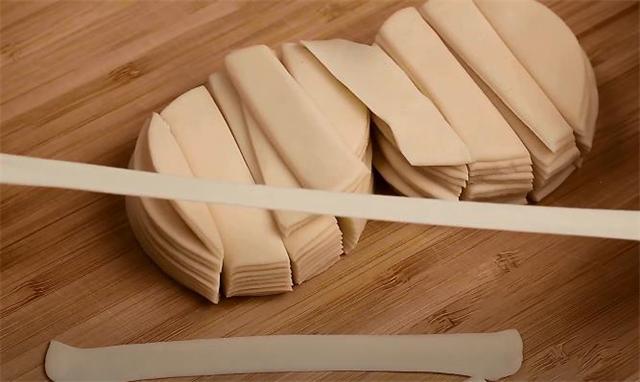 1.先把餃子皮用刀這樣給它切開,切成1.5厘米左右的長(zhǎng)條。