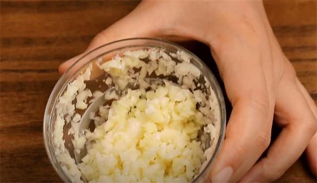 3.往拉蒜器里面放入幾個(gè)大蒜,輕輕幾秒給它拉成蒜末備用。