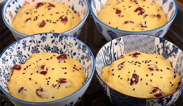 6.準備四個小碗,往碗里面都刷上一層食用油防粘,碗的底部放一點葡萄干,把面糊都放到四個碗里面,再撒上一點黑芝麻,蓋上鍋蓋,二次醒發10分鐘,然后大火蒸熟。