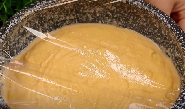 3.打好之后倒入盆中,加入4g酵母粉和20g白糖,用筷子攪拌均勻,酵母粉攪拌融化之后,再加入300g普通面粉,再加入100g玉米面,然后把它們完全攪拌均勻,攪拌成這樣粘稠的糊狀就可以了,蓋上保鮮膜,放在溫暖的地方醒發至兩倍大。