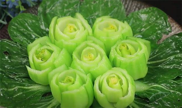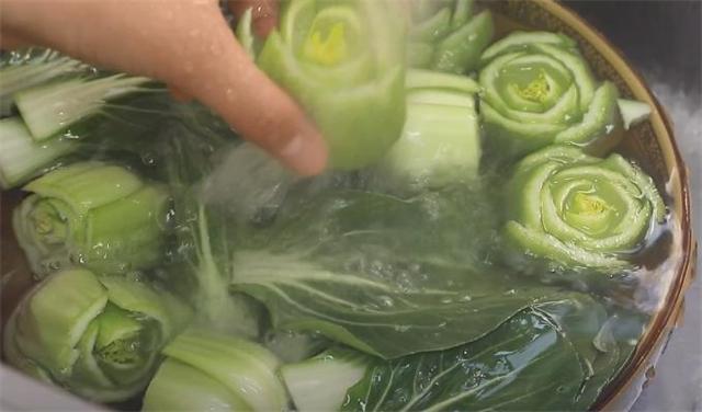 6.然后把葉子這樣沿著盤子邊緣擺上一圈,再把上海青的根部擺放到中間。