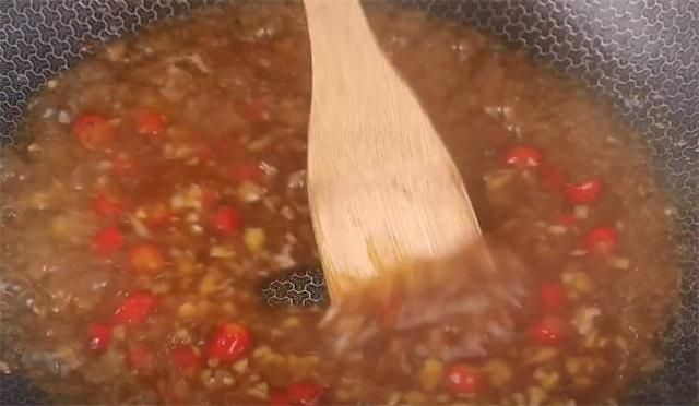 7.起鍋燒油下入蒜末和小米辣炒香,炒香后加入食鹽和白糖,再加點生抽,加點素蠔油翻炒均勻,然后再淋入一點水淀粉,大火煮至濃稠之后關火。