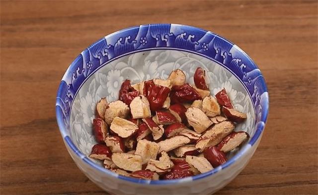 4.再準備幾個紅棗,用剪刀把紅棗核去掉,把棗肉給它剪成小碎丁,剪好之后放入碗中備用。