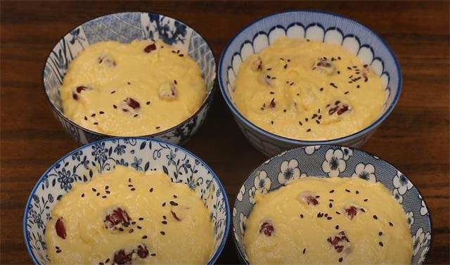 6.拌勻之后再準備幾個小碗,往上面刷上一層食用油,這樣可以防粘,再把面糊慢慢的倒在小碗里面,這里注意不要倒得太滿,倒八分滿就可以了,用筷子把面糊的表面整理平整,往上面再撒上一點黑芝麻增香。