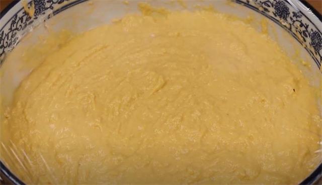 3.往里面加入4g酵母粉,再加入20g白糖,用筷子攪拌均勻,攪拌至酵母粉完全融化以后,碗里面再加入300g普通面粉,加入50g玉米面,再加入50g糯米粉,將它們完全攪拌均勻,要稍微多攪拌一會兒,攪拌成這種偏干一點粘稠的面糊就可以了,然后蓋上一張保鮮膜,放在溫暖的地方醒面50分鐘左右。