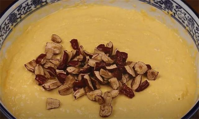 5.面糊已經醒好了,把紅棗丁放到面糊上面,然后用筷子給它攪拌均勻。