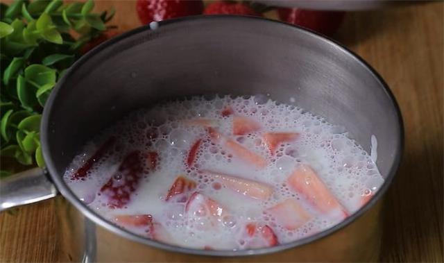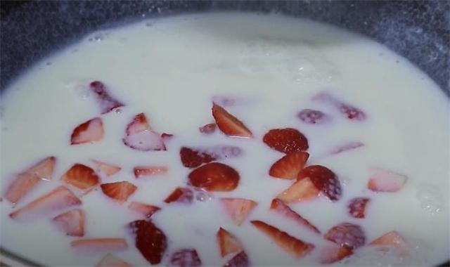 4.往鍋里面加入500毫升的純牛奶,再加入20g白糖,加入40g白涼粉,開小火之后不停的攪拌,煮開之后關火,然后倒入草莓。