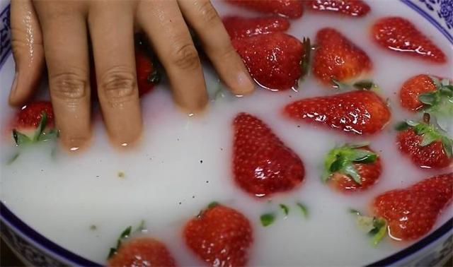 1.先準備一盆清水, 往里面加入一勺食鹽,再加入一勺面粉,然后充分攪拌均勻,再把草莓輕輕放進去,這里需要注意一點,草莓的蒂不能去掉,如果去掉了,在清洗草莓的時候,就會有大量的污垢滲到里面,這樣的話草莓就會越洗越臟,因為草莓的表皮非常薄,一不小心就會把草莓給它抓破,所以清洗的時候一定要輕一點,之所以加入面粉,是因為面粉具有非常強的吸附性,可以吸附掉草莓上面的臟東西,包括一些肉眼看不到的蟲卵,食鹽具有殺菌的作用,大概清洗兩分鐘左右,我們可以看一下,臟東西全都跑出來了,下面把水倒掉。