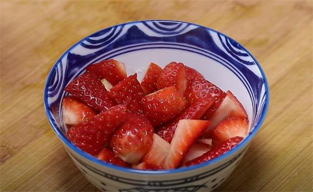 3.順便給大家分享一個草莓特別好吃的做法,準備五六個草莓給它切成小塊,切好之后裝入碗中備用。
