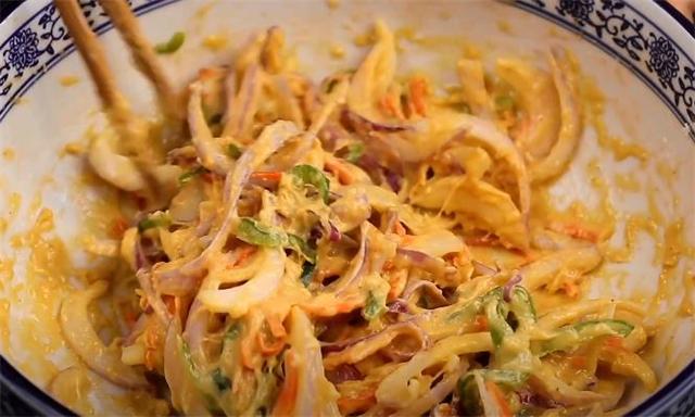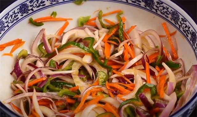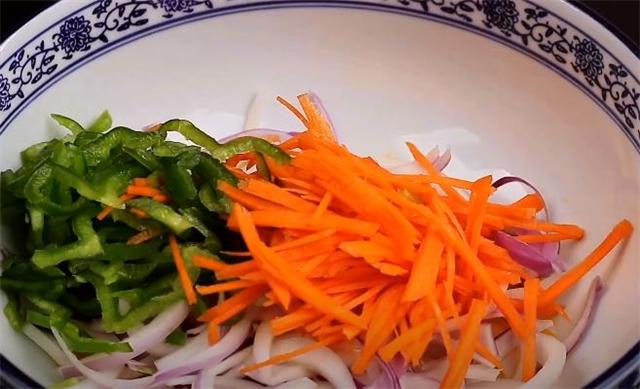 2.準備一根青椒給它切成青椒絲,然后再稍微切一點胡蘿卜絲,切好也裝入碗中。