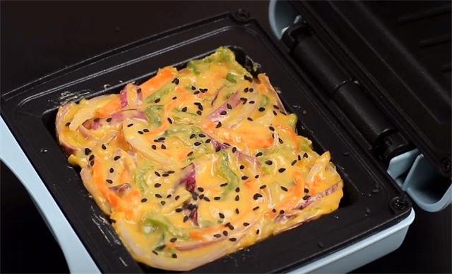5.早餐機預熱之后刷上一層食用油,放入洋蔥面糊給它抹平,接著再撒一點黑芝麻,然后蓋上蓋子給它烙熟。