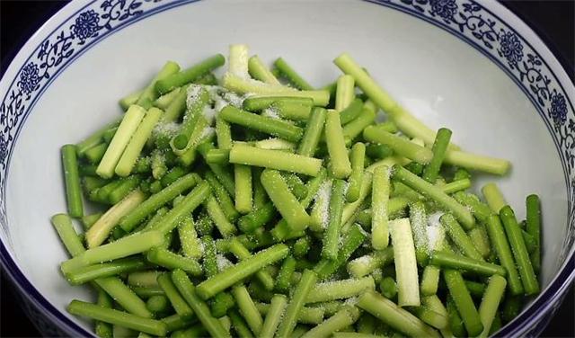 3.然后把蒜苔再放到盆子里,撒入15g的食鹽,用筷子攪拌均勻之后腌制3個小時左右。(www.ws46.com)