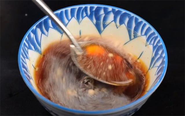 5.下面來調一個特別重要的料汁,半碗清水當中加入兩勺生抽,再加一勺素蠔油,適量的食鹽、白糖和白胡椒粉,用勺子攪拌均勻之后備用。
