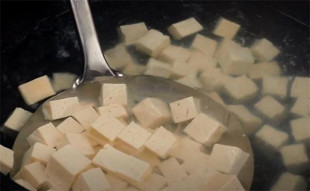 2.鍋里水開之后加入3g食鹽,把豆腐丁下鍋焯水除去豆腥味,焯水一分鐘左右撈出備用。