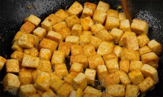 4.起鍋燒油,油熱之后下入豆腐開始煎,煎至金黃之后出鍋備用,煎成這樣就可以了。