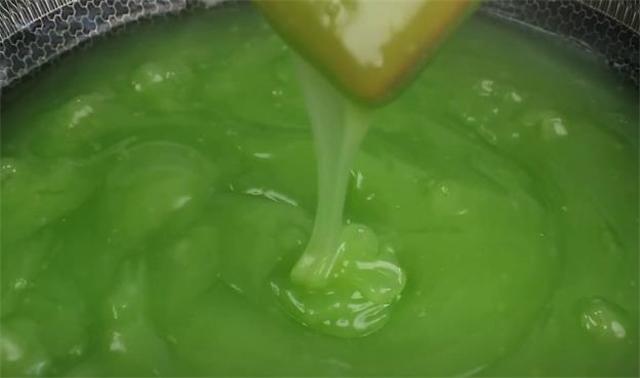 4.用盛豌豆淀粉的碗,往鍋里面加入5碗清水,燒至鍋底冒泡之后倒入黃瓜淀粉水,然后開中火開始煮,煮的同時要不停的攪拌以免糊鍋,煮至這樣透明冒大泡,說明已經熟了。