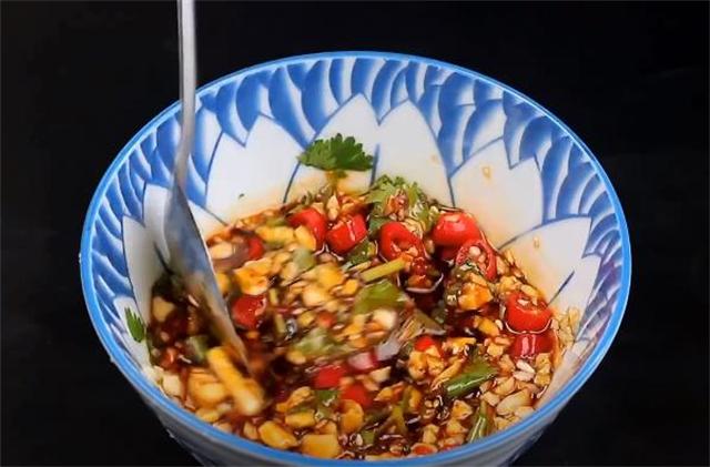 6.下面來調一個料汁,碗中加入蒜末,小米辣,香菜和適量的食鹽,再加入一勺生抽和兩勺陳醋,再加入一勺小磨香油和一勺辣椒油,用勺子攪拌均勻之后備用。