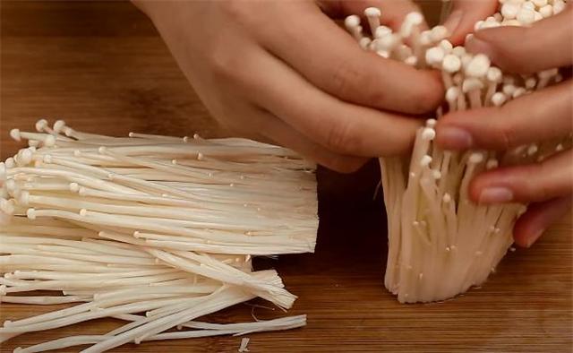 1.準備一把金針菇洗凈,用刀切去根部,撕成小朵后備用。