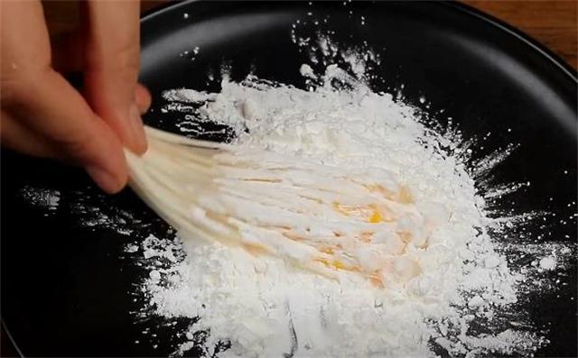 2.金針菇沾上一點清水,再均勻地裹上一層玉米淀粉。