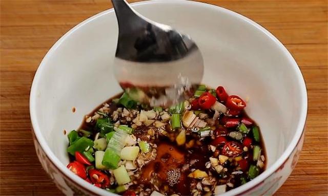 4.切好裝入碗中加點(diǎn)食鹽和白糖,加入生抽和陳醋,再加點(diǎn)香油,用勺子攪拌均勻,料汁就做好了。