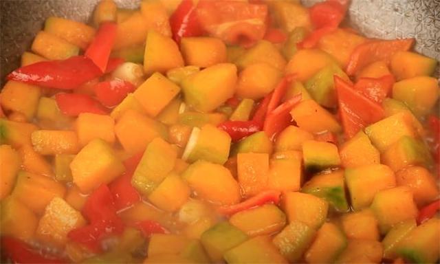 5.起鍋燒油,加入大蒜爆香,炒香之后加入南瓜丁,翻炒兩分鐘左右倒入紅椒,然后把剛剛調好的料汁倒進去,蓋上蓋子把水分燜干,煮熟之后即可出鍋。