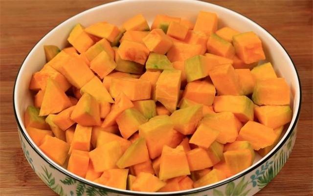 1.準備一小塊南瓜,先把南瓜皮給它去掉,再把南瓜切成小丁,切好之后裝入盆里。(www.ws46.Com)