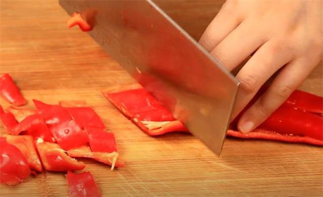 2.準備一根紅椒,把它切成小段。